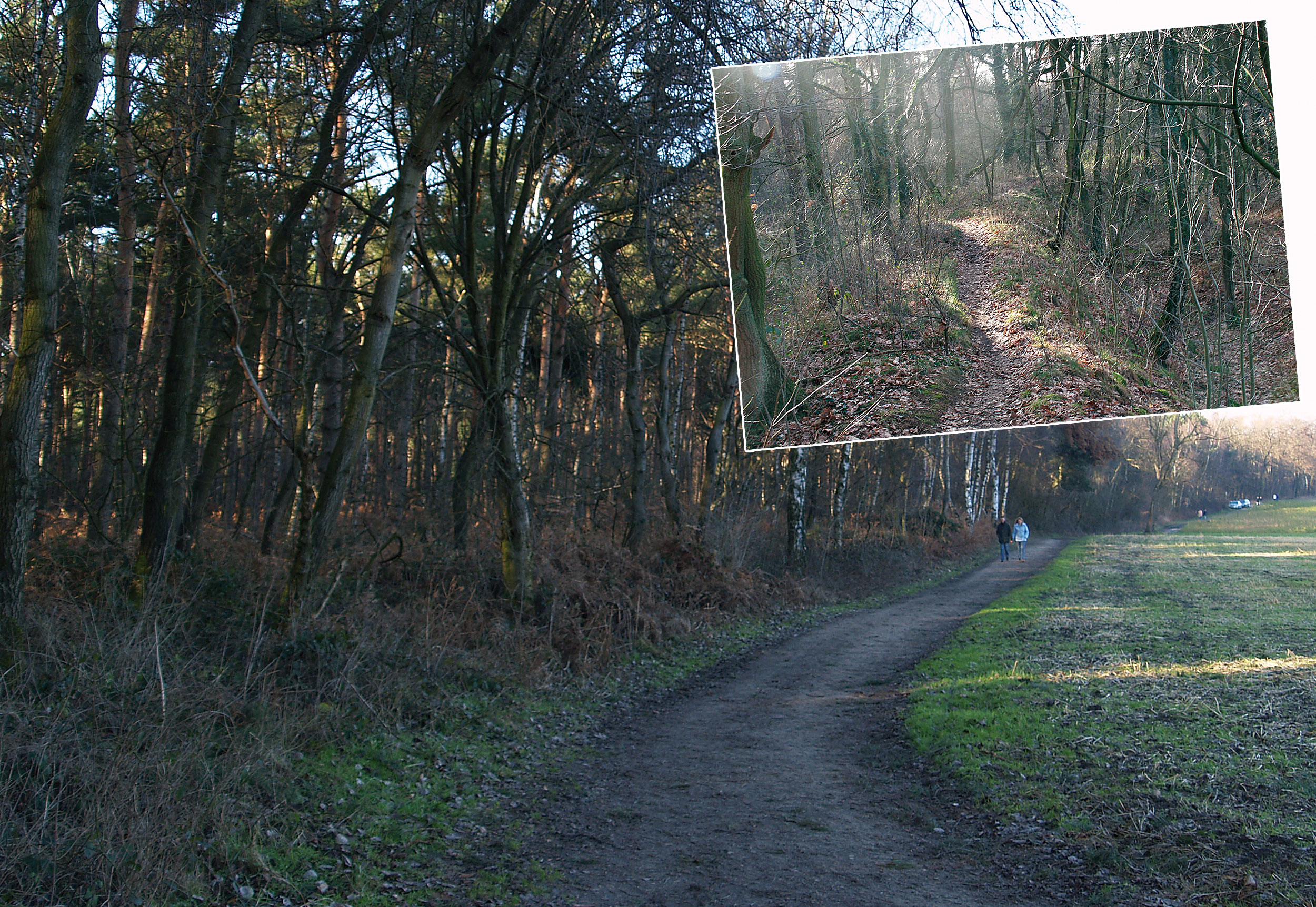 Entlag des Waldrandes zieht sich der Wall der historische Landwehr, die im Mittelalter erbaut wurde.