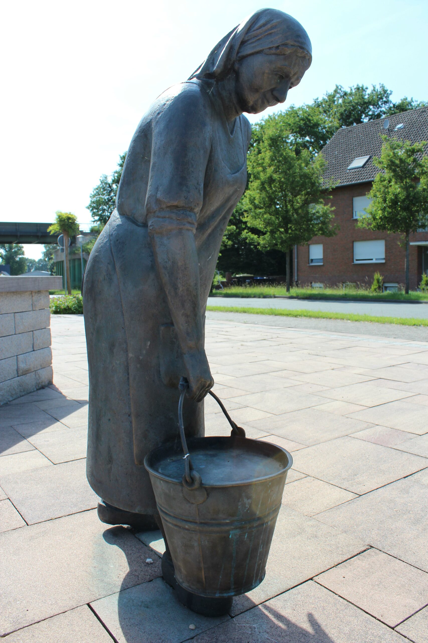 Die von Erika Rutert geschaffene Skulptur „Tante Sina mit Wippött“ exemplifiziert die einst anspruchsvolle Wasserbeschaffung und gewährt Einblicke in historische Alltagsprozesse in Alpen Menzelen-Ost.